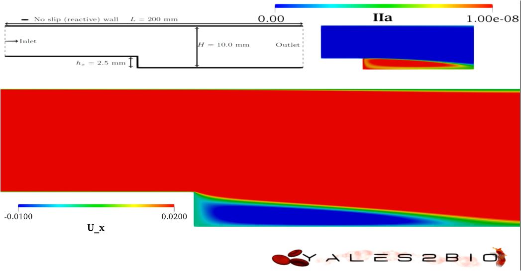 The evolution of the thrombus (white contour) is displayed in the movie which also demonstrates that the velocity field is influenced by the growing thrombus. In the upper part of the video, the computational domain is presented along with the thrombin concentration field at the first minutes of the thrombus formation process. More details can be found in Mendez et al., Biomech. Model. Mechanobiol., 2018.